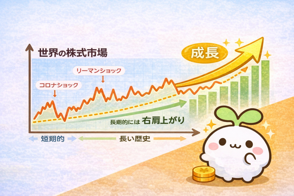 まず知ったのは、世界の株式市場は長い歴史で見ると基本的に右肩上がりで成長しているということです。